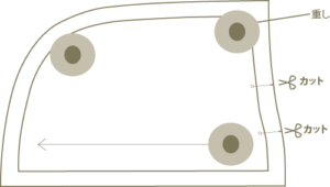 型紙に「わ」と書いてある辺は、生地を二つ折りにした折り目と合わせ、生地が2枚重なった状態で裁断します。