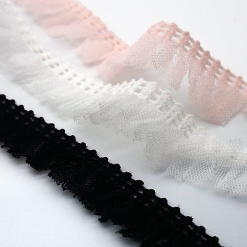 写真は襟と足のリブを縫うときにチュールフリルストレッチレースを挟んで縫い合わせています。