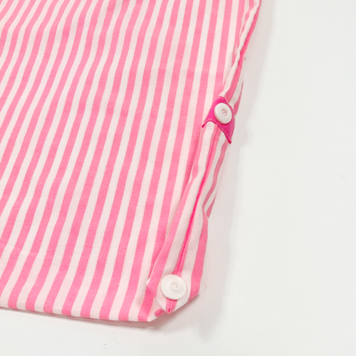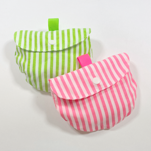スナップボタンで開閉かんたん、生地に合わせた色のタブがついているのでフックをつけたりできます。