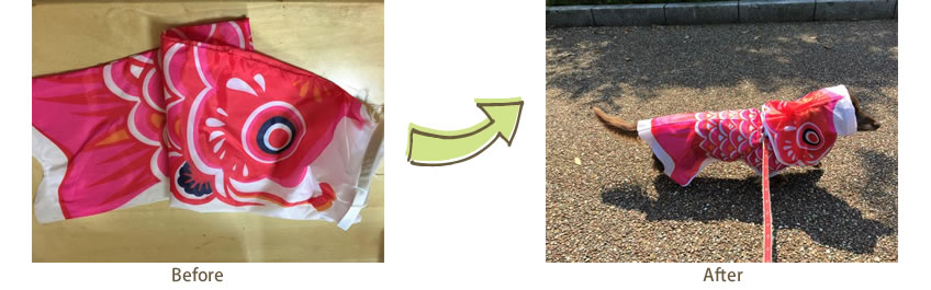 伝統通り背開きになっていた小さい鯉のぼりを三枚おろしにし、リメイクしました。 こだわりのポイントは、スライドするフードです。フードを取った時も鯉の顔が前を向くように、工夫してみました。 屋根より低い鯉のぼり…地面スレスレで優雅に泳ぎます(笑)