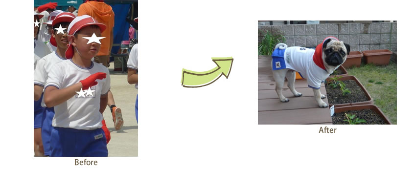 体操服を体操服へ、という発想が鼻ペチャ犬たちが持つユーモアでチャーミングな点にぴったりですね!