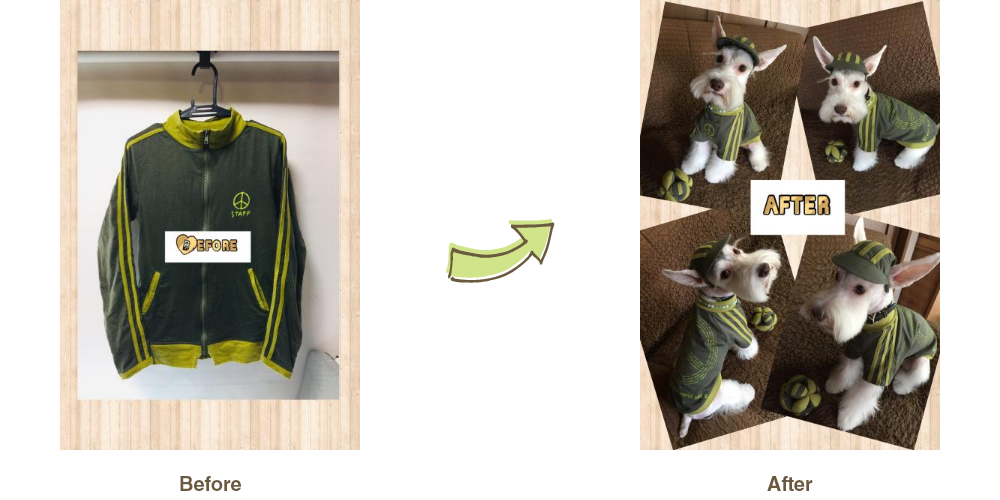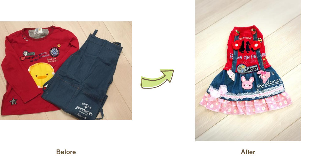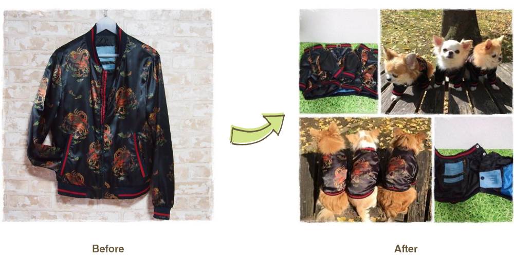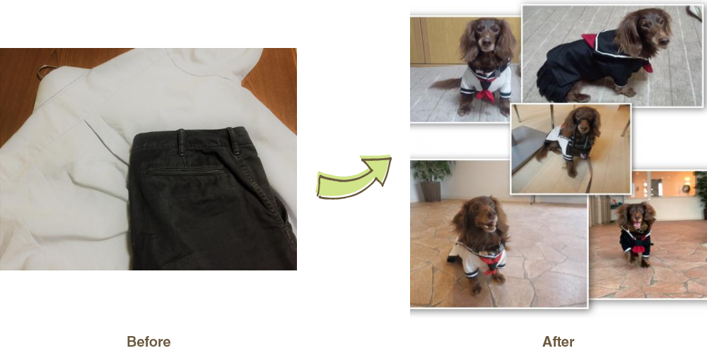 長年着ていると、愛着もわいてくるものですがそんな服をずっと残せるのがリメイクわんこ服のよいところ!