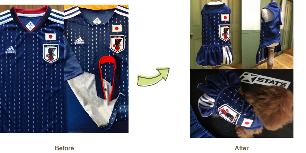 サッカー日本代表チームのユニフォームをワンピースにリメイクしました。肩の3本線が、スカートの部分にちょうど良い長さでしたので好い感じに仕上がりました。