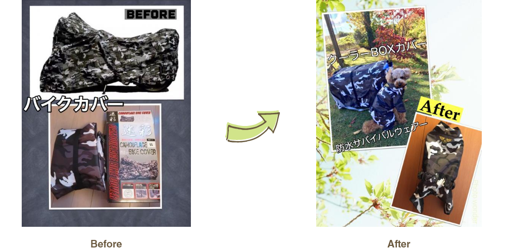 迷彩柄と、防水仕様を活かして愛犬なっくん(♂)のサバイバルウェアー(レインコート)と、アウトドアには欠かせないクーラーBOXカバーをお揃いで作製。