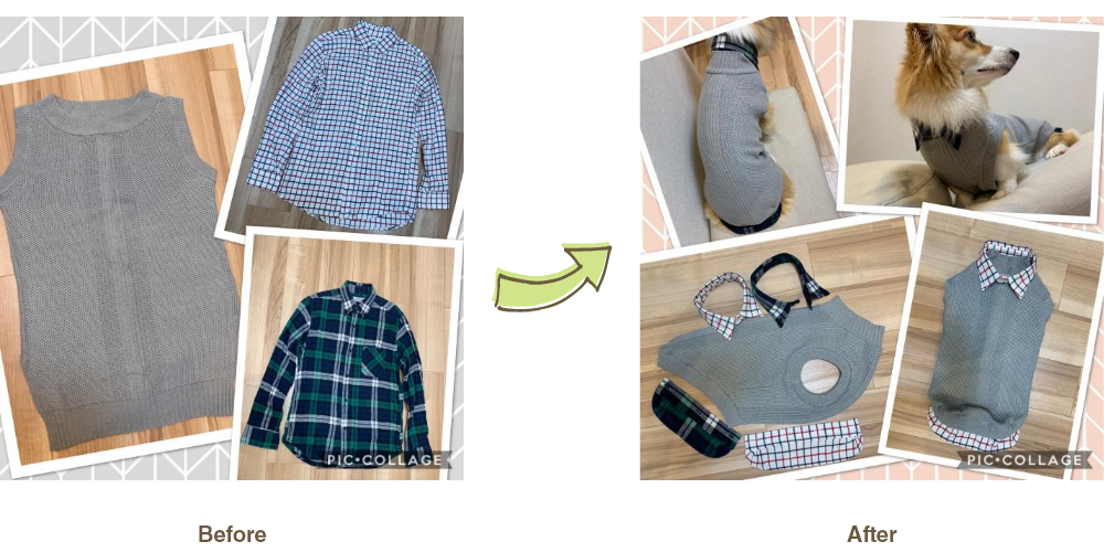 レディースサイズのニットベストをチョキチョキ愛犬2Lサイズのノースリーブへリメイクし(裾裏にボタン付け)、シャツ襟のチョーカー(ボタン裏ゴム付けで楽に脱着)と、取り外し可能なシャツ裾(シャツボタンホール部分利用)へ、何通りにも着まわせるキャンパススタイルにリメイクしました。