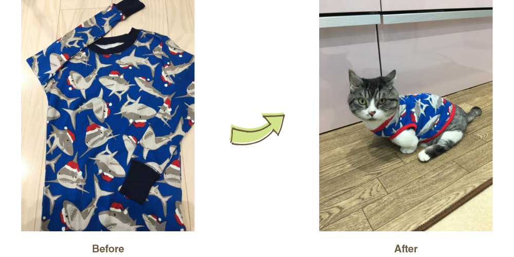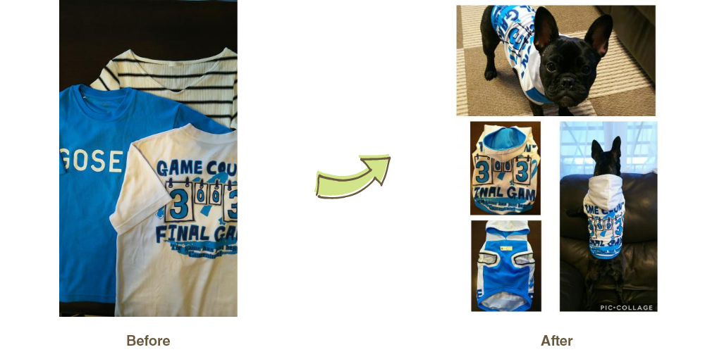 このリメイクは、シャツの首周りが,愛犬の首周りにジャストフィットだったことでひらめきました。