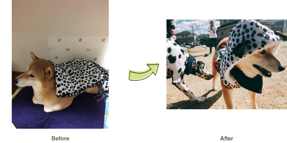 以前飼っていたダルメシアンが亡くなった後でダルメシアンのオフ会へ参加するようになりました。その際に一緒に連れて行った柴犬にダル柄の服を着せたく、マフラーをリメイクしました。