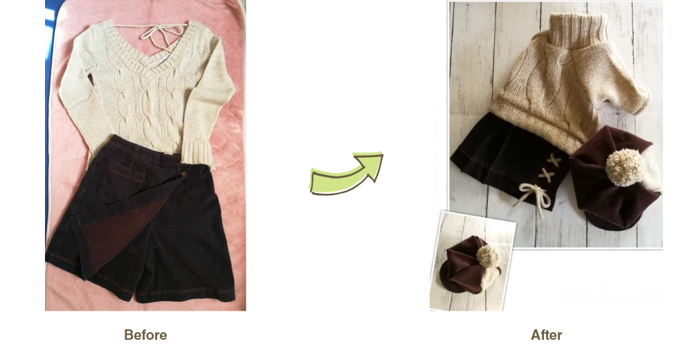 着なくなった自身の服をリメイクしました。縄編み部分を背中に合わせリブはそのまま利用。スカートはキュロットのため幅が足りず、生地の裏側を切り替え風にして、セーターに付いていたヒモを結んでポイントにしました。同様にセーターとスカートの生地を使い、服とお揃いのキャスケットを作りました。残ったセーターをほどいて作ったポンポンがポイントです。