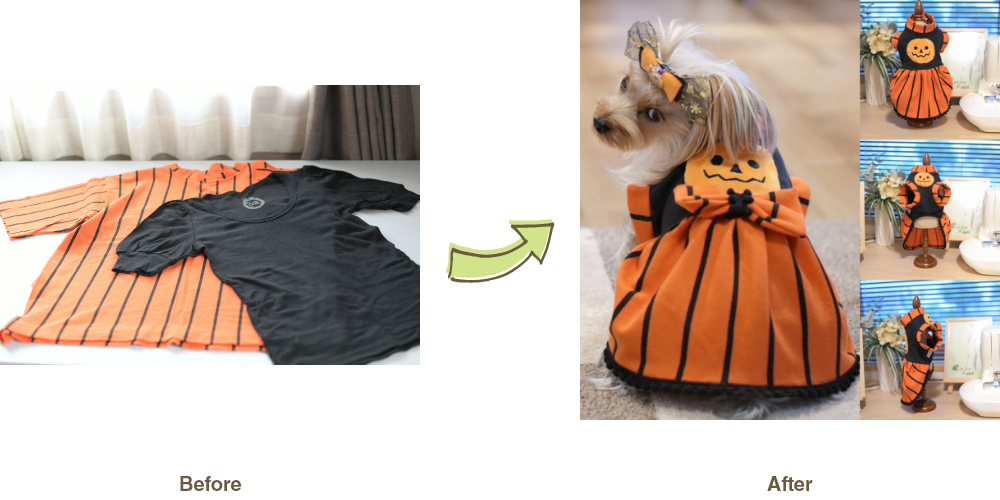優秀賞という素晴らしい賞をいただき、心から感謝申し上げます。初めての応募でしたが、100着の応募作品を拝見した時には、こんなにも多くの方がリメイクして応募されているのだと驚きが隠せませんでした。我が家の愛犬は服が大好きです。