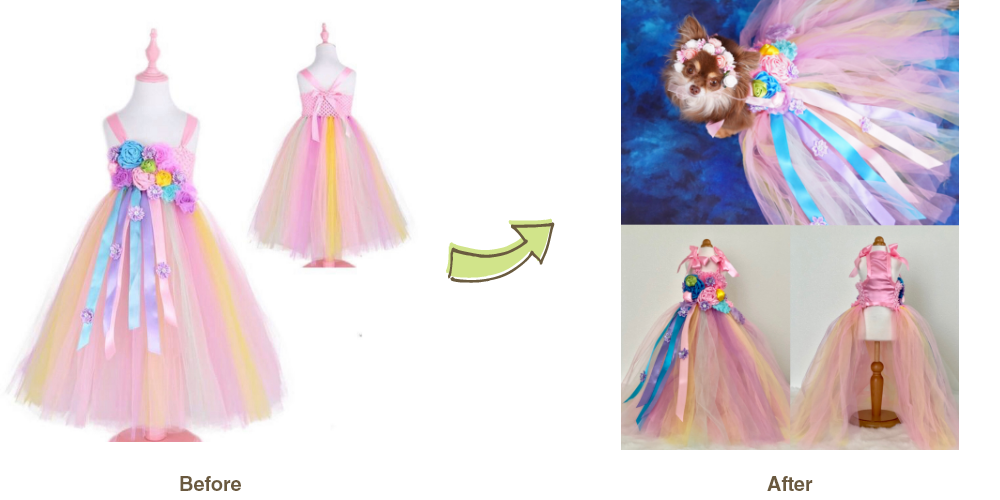 愛犬にロングドレスを着せたくて、子供用のドレスをリメイクしました。元のデザインを活かしつつ、2キロの愛犬のサイズに仕上げました。