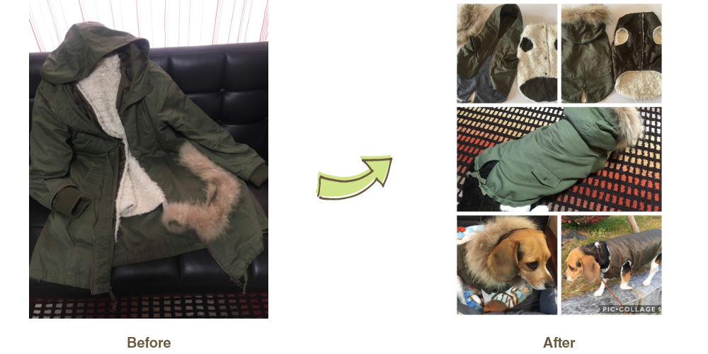 10年以上着古したお気に入りのコートが捨てられず、ワンコのモッズコートにリメイクしました。ファスナーや袖口のリブなど、使えるパーツはとことん使って無駄なく仕上がりました。インナーはリバーシブルのベストにしました。取り外せるファーがライオンみたいでお気に入りです♡