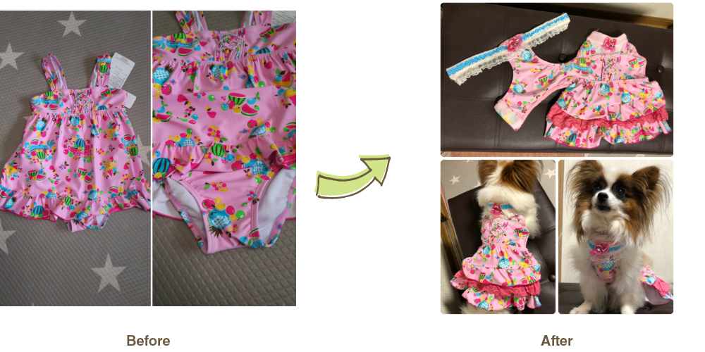 水着のリメイクです。 子供の水着を見つけ、「おっ?!コレはパンツのサイズがウチの犬にピッタリそう!!」となんとなく勘で思いました。 見事に勘が大当たり! 水着のパンツの部分を二つに切り、前側をだけ使用し、上下逆さまにして、前身頃に使いました。 人間のウエスト部分が、ちゃんと犬のウエスト位置にくるように使いました。 パンツの部分は、縫う箇所もなく、そのまんま使用できました。 まさか!そんな使い方をするなんて!と周りの人に大笑いされました。笑 そして、残りのワンピースの部分を後ろ身頃に使用しました。ポイントは、 ⚪︎パンツがそのまま使用できた! ⚪︎雨の日に着ても水をはじき、汚れてもサッと落ちる! ⚪︎外出先でパッとそのままプールにも入れる! ⚪︎段フリルスカートの間にアクセントとして濃い色合いのピンクレースを入れた。 ⚪︎襟には水着の柄の色合いに合わせたレースやリボンを使いにした。