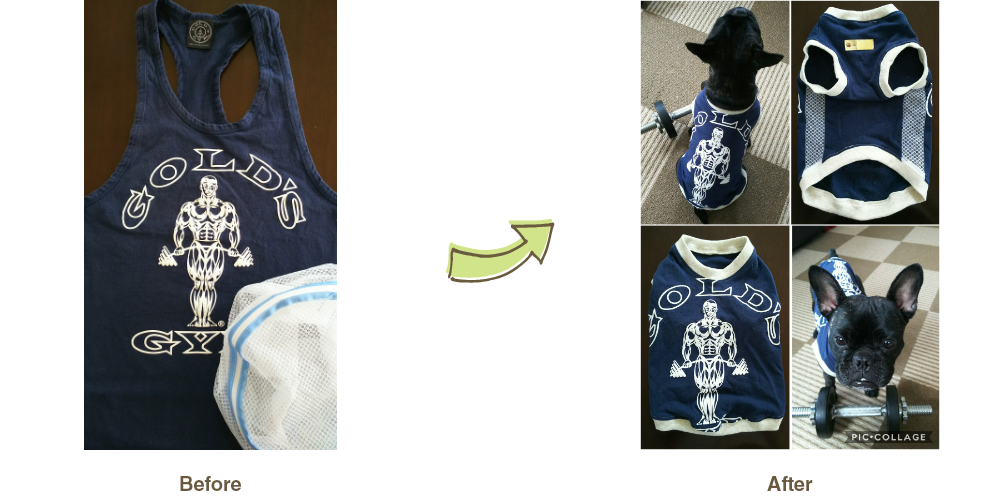 旦那さんの着なくなったGOLD'S GYMのタンクトップと100円ショップの洗濯ネットで。 脇をネットにしたのでちょっと通気性がよくなってると思います。 ワンコはダンベルを使って筋トレはしませんが、散歩で坂道をよく歩くせいか筋肉はムキムキです!