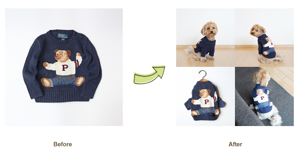 9月に女の子が産まれる予定です。愛犬(オス)と赤ちゃんにお揃いのお洋服を着せたいと思い、娘にはピンクのくまさんセーターを購入、愛犬にはネイビーのくまさんセーターをリメイクしました。同じセーターでお出かけする姿を見る事がとても楽しみです。また、愛犬は寒がりなので暖かいセーターで快適な冬を過ごして欲しいと思います。