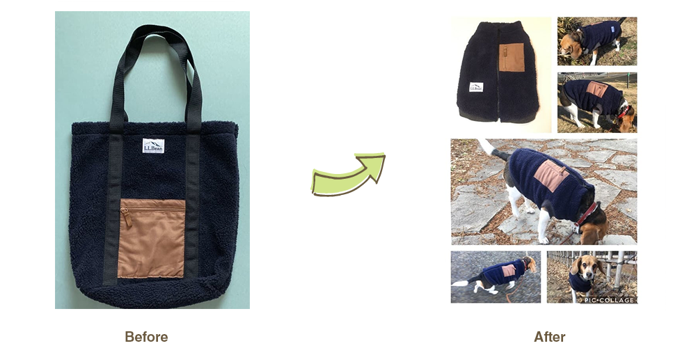 雑誌の付録のフリーストートバッグを犬服にリメイクしました。アウトドアテイストそのままのイメージで、あたたかいフリースベストができました。