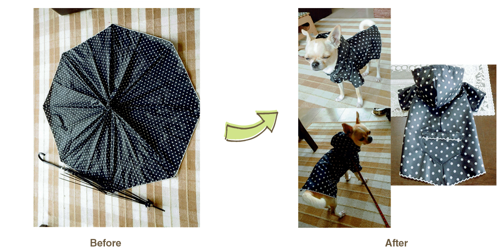 今年の梅雨は長かったですよね。愛犬と雨の日も楽しく散歩がしたいなぁという思いから、レインコートを作ってみました。骨が折れた傘から布地をはずして、シンプルで着やすいレインコートができました。背中のポケットがポイントです♪ これを着て、雨の日も楽しく散歩ができました!