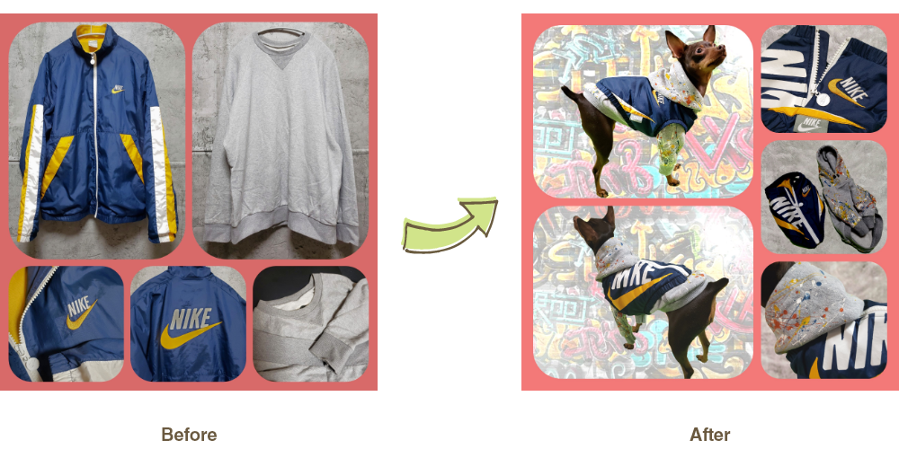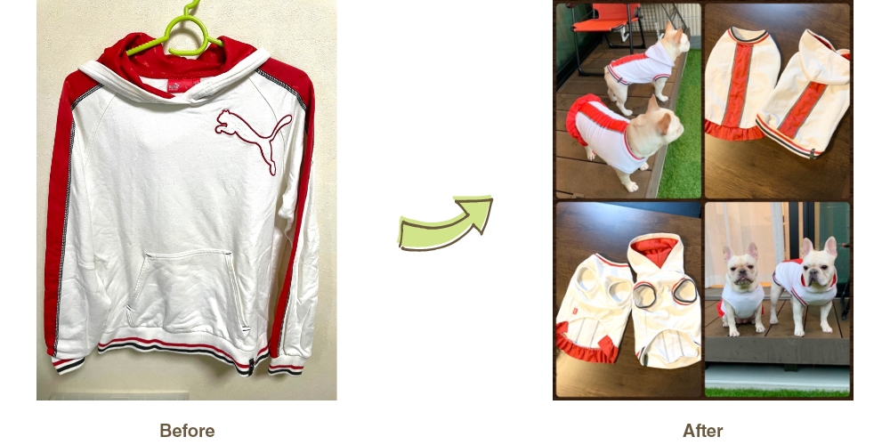 スポーツパーカー1着を余すことなく使って、仲良しワンちゃん2匹のおそろい服にリメイクされていて感激しました。