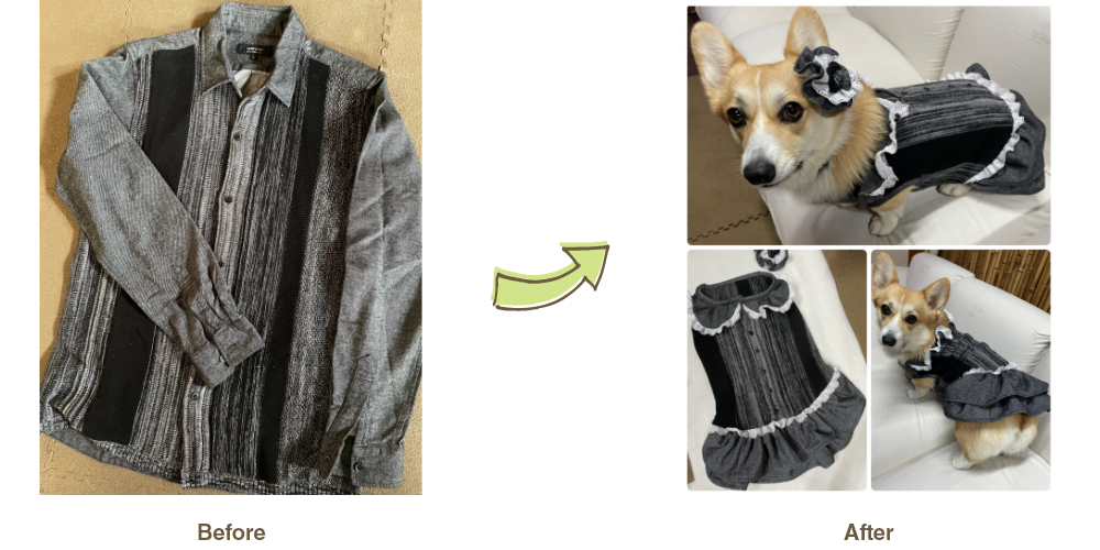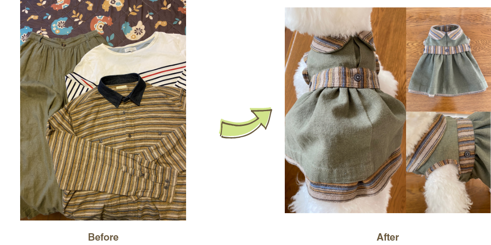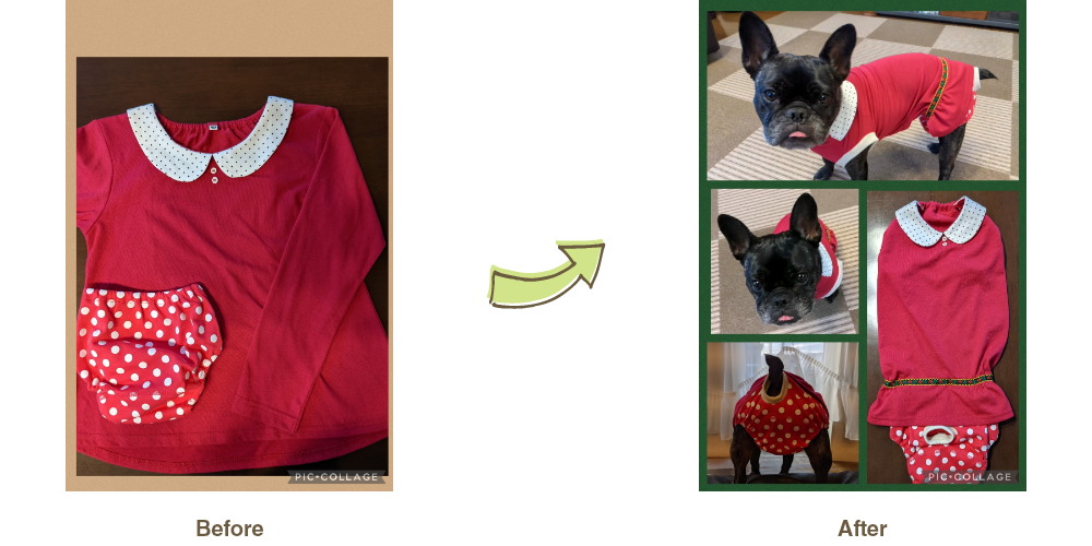 愛犬に可愛い服を着せたい私、着せるのが嫌な主人、でも主人の服のリメイクなら満更でもないようなので、今回も主人の着なくなったシャツを利用してみました。 シャツの前身ごろはニット地でしたので伸縮性がありワンコの身ごろにぴったりで、残りの布帛部分をスカートに利用しました。 メンズのシャツからは想像しにくい女の子らしいふりふりワンピにリメイクでき、クリスマスやお正月に活躍しそうです。