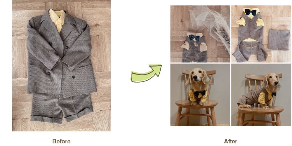 結婚式にて、リングドッグをするわんちゃんのためにタキシードを製作いたしました。 新郎が幼い頃に着ていた思い出がたくさん詰まったスーツをリメイクしてタキシードにしました。 黄色のシャツにブラウンのスーツなので、タキシードのデザインもカジュアルお洒落に仕上げました。