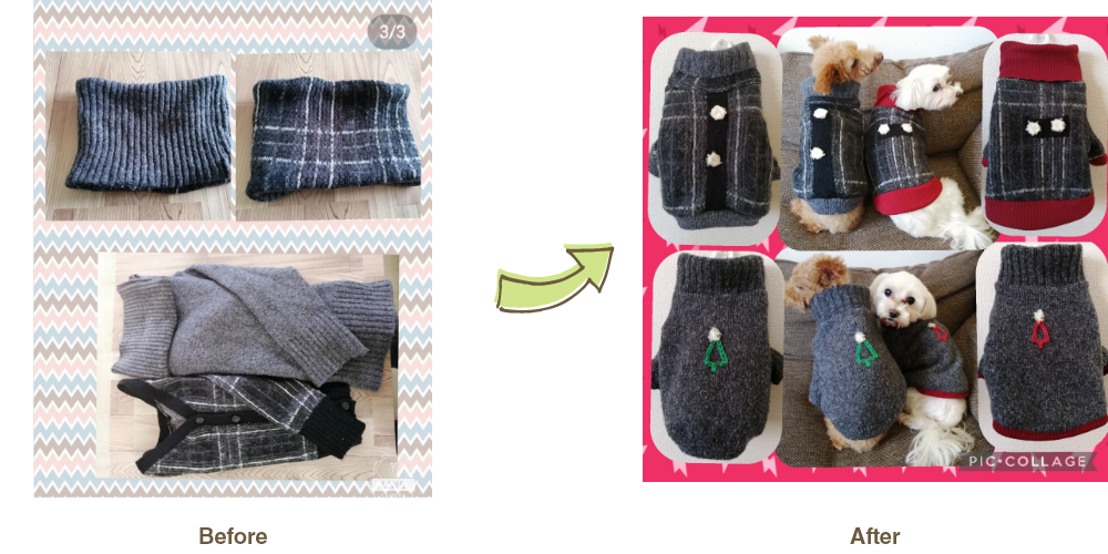 millamillaさんの型紙使用。娘の着なくなったセーター2枚で愛犬2匹のリバーシブルセーターを作りました。Xmasツリーをワンポイント刺繍入り。残りで飼い主用ネックウォーマーもできて、お揃コーデになりました!